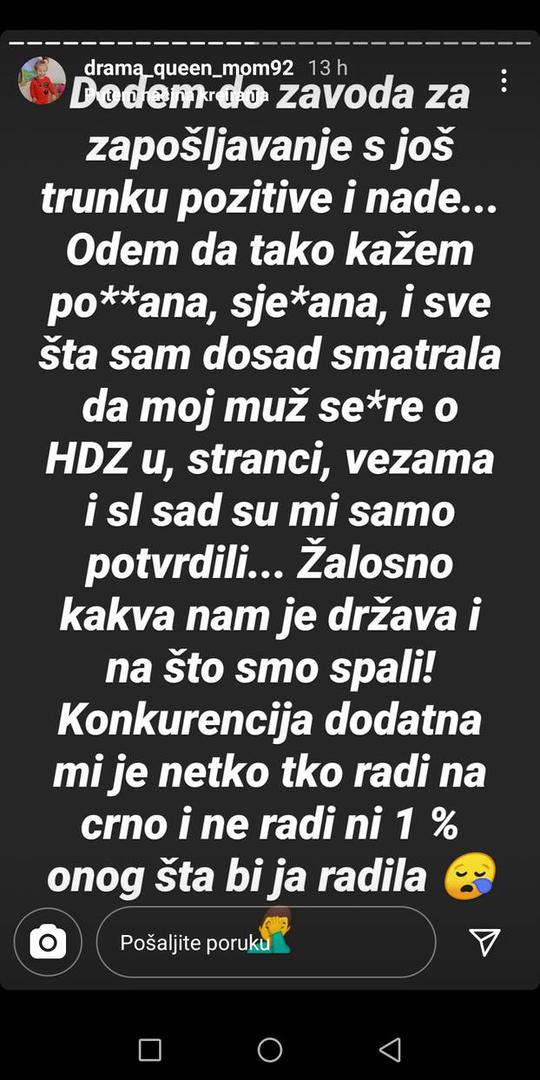 - Dođem do Zavoda za zapošljavanje s još trunku pozitive i nade... Odem da tako kažem pos*ana, sje*ana, i sve što sam dosad smatrala da moj muž se*e o HDZ-u, stranci, vezama i slično, sad su mi samo potvrdili - otpočela je ljutito objavu. - Žalosno kakva nam je država i na što smo spali! Konkurencija dodatna mi je netko tko radi na crno i ne radi ni 1% onog što bih ja radila - dodala je.