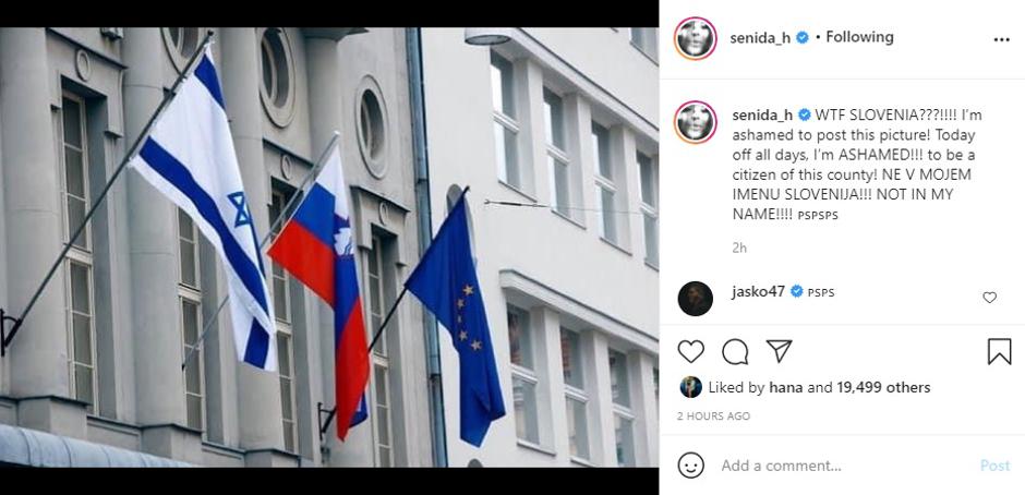 "WTF SLOVENIA???!!!! Sramim se objaviti ovu fotografiju. Danas od svih dana, sramim se što sam državljanka ove zemlje. Ne u moje ime", napisala je uz fotku i dodala slova PS u znak podrške Palestini.