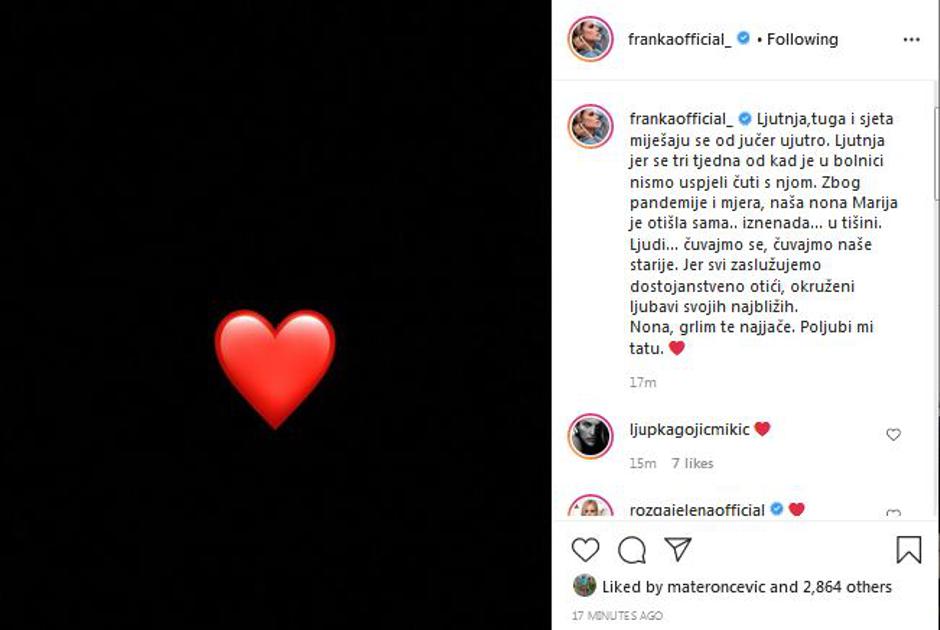- Ljutnja,tuga i sjeta miješaju se od jučer ujutro. Ljutnja jer se tri tjedna od kad je u bolnici nismo uspjeli čuti s njom. Zbog pandemije i mjera, naša nona Marija je otišla sama.. iznenada... u tišini - napisala je Franka pa uputila i važan apel svojim obožavateljima.