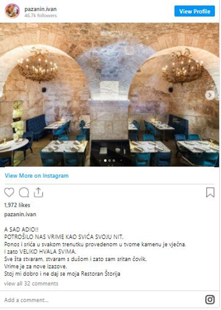 ''A sad adio! Potrošilo nas vrime kao svića svoju nit. Ponos i srića u svakom trenutku provedenom u tvome kamenu je vječna. I zato veliko hvala svima. Sve šta stvaram, stvaram s dušom i zato sam sritan čovik. Vrime je za nove izazove. Stoj mi dobro i ne daj se moj restoran Štorija'' napisao je Pažanin.