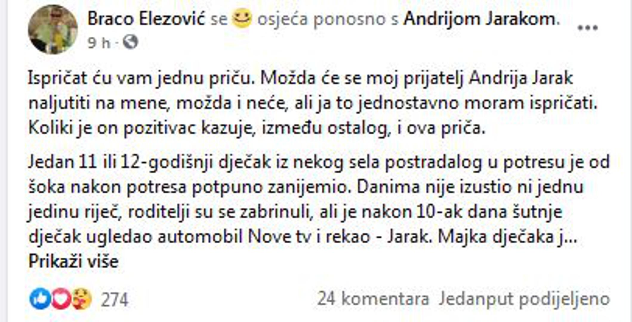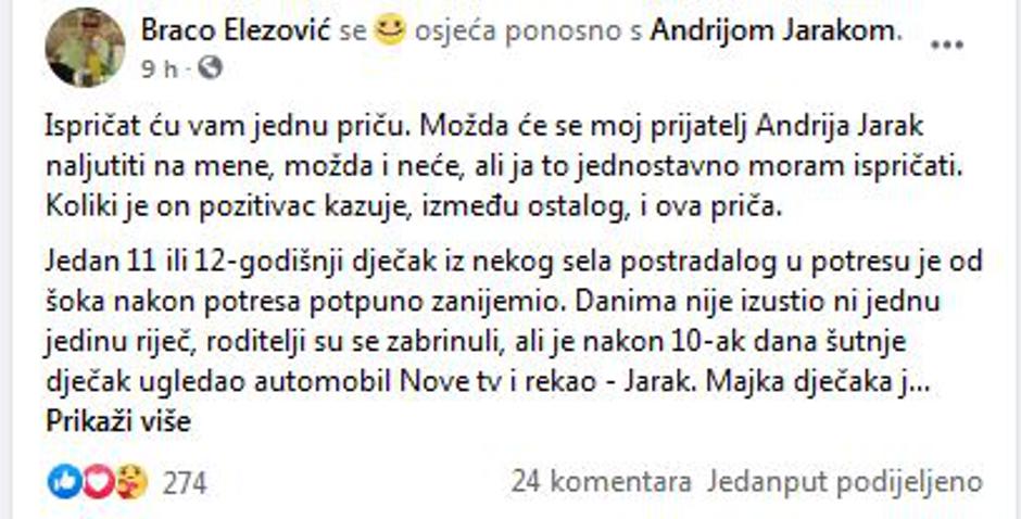 Naime, Jarak je svojom pojavom uspio da jedan dječak iz stradalog područja koji je nakon potresa zanijemio ponovno progovori. –Ispričat ću vam jednu priču. Možda će se moj prijatelj Andrija Jarak naljutiti na mene, možda i neće, ali ja to jednostavno moram ispričati. Koliki je on pozitivac, kazuje, između ostalog, i ova priča – započeo je Elezović svoju objavu.
