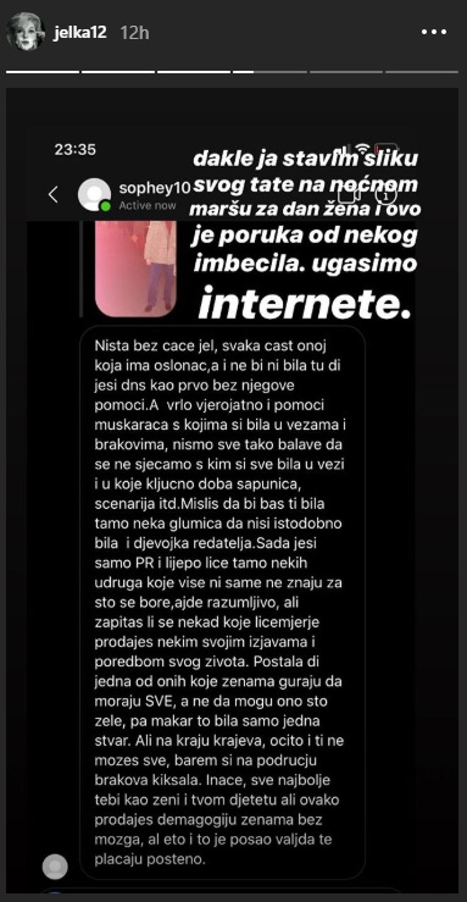 "Dakle ja stavim sliku svog tate na noćnom maršu za Dan žena i ovo je poruka nekog imbecila. Ugasimo internete", napisala je Veljača i objavila presliku poruke u kojoj piše: