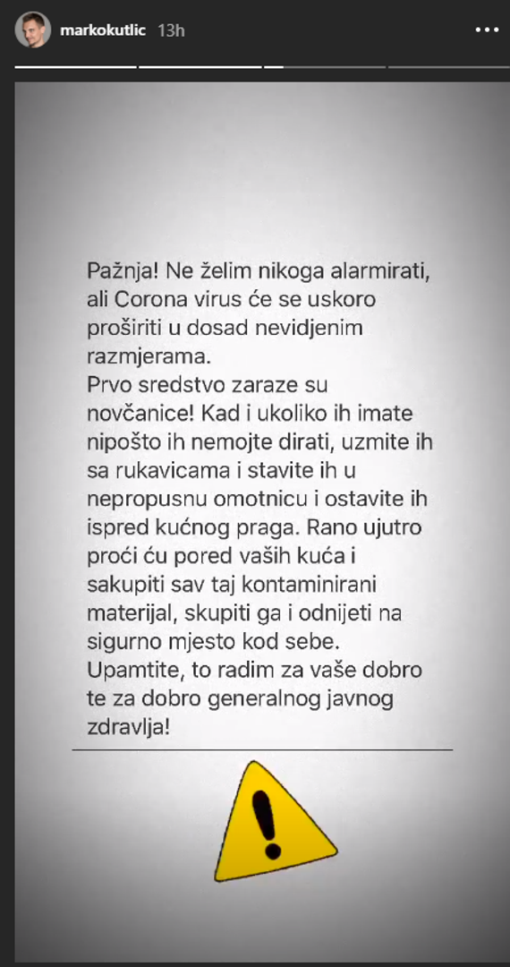- Pažnja! Ne želim nikog alarmirati, ali koronavirus će se uskoro proširiti u dosad neviđenim razmjerima. Prvo sredstvo zaraze su novčanice. Kad i ako ih imate, nipošto ih nemojte dirati, uzmite ih rukavicama i stavite ih ispred kućnog praga. Rano ujutro proći ću pored vaših kuća, sakupiti sav kontaminirani materijal i odnijeti ga na sigurno kod sebe. Upamtite, to radim za vaše dobro te za dobro generalnog javnog zdravlja - napisao je Marko.