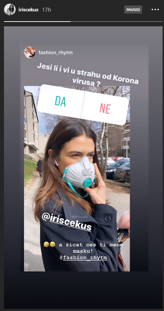 Voditeljica InMagazina Iris Cekuš dočekala je koronavirus s maskom na licu i ne boji se ničega. Doduše, našla se na meti prijateljice kojoj je poručila da će ju sigurno "žicati baš tu masku kasnije".