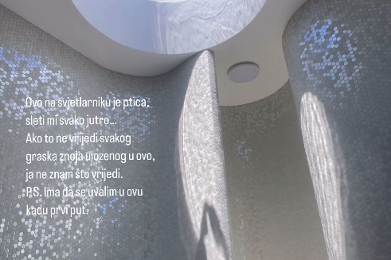 Zatim se ponovno javila te otkrila da je održala prvu zabavu u vili. „Imamo prvi mini party!” pohvalila se voditeljica. Potom je podijelila fotografiju svoje luksuzne kupaonice. „Ovo na svjetlarniku je ptica, sleti mi svako jutro... Ako to ne vrijedi svakog graška znoja uloženog u ovo, ja ne znam što vrijedi. P.S. Ima da se uvalim u ovu kadu prvu put”, napisala je Nikolina na fotografiju. U snimci na Instagram priči podijelila je još neke dijelove interijera.