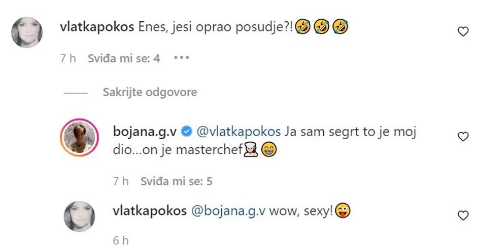 Vlatku Pokos zanimalo je tko je na kraju oprao suđe pa je ispod jedne zajedničke fotografije na kojoj glumica pozira sa suprugom ostavila komentar: "Enes, jesi oprao posuđe?" Ubrzo se javila i Bojana. "Ja sam šegrt, to je moj dio. On je masterchef", napisala je Bojana. "Wow, sexy!", uzvratila je Vlatka.