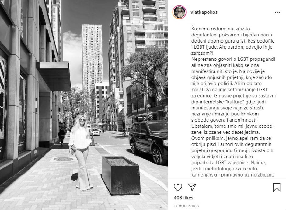 "Gospodin Grmoja bi trebao znati da su pripadnici LGBT zajednice u pravilu tolerantni i miroljubivi jer najbolje znaju sto znači biti minoriziran, obespravljen i zlostavljan na sve moguće načine! Društvo naših starih bilo je itekako seksualizirano što se očituje kroz narodne običaje, pjesme i uporabne predmete. Da ne spominjem da su se naše bake udavale već s 14 godina. Dakle, vrlo rano stupale u seksualne odnose. U doba interneta svoju djecu je moguće zaštiti jedino edukacijom, nikako zabranama. Nije valjda da Nikolica s Božom prikolicom ne vjeruje u institucije pravne države koju predstavlja? I kojima se rado koristi za progon Pridea", stoji u Vlatkinoj objavi koju je zaključila riječima: