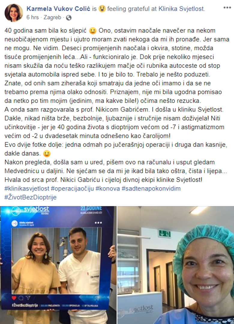 "A onda sam razgovarala s prof. Nikicom Gabrićem. I došla u kliniku Svjetlost. Dakle, nikad ništa brže, bezbolnije, ljubaznije i stručnije nisam doživjela! Niti učinkovitije - jer je 40 godina života s dioptrijom većom od -7 i astigmatizmom većim od -2 u dvadesetak minuta odneseno kao čarolijom! Evo dvije fotke dolje: jedna odmah po jučerašnjoj operaciji i druga dan kasnije, dakle danas. Nakon pregleda, došla sam u ured, pišem ovo na računalu i usput gledam Medvednicu u daljini. Ne sjećam se da mi je ikad bila tako oštra, čista i lijepa...Hvala od srca prof. Nikici Gabriću i cijeloj divnoj ekipi klinike Svjetlost!"