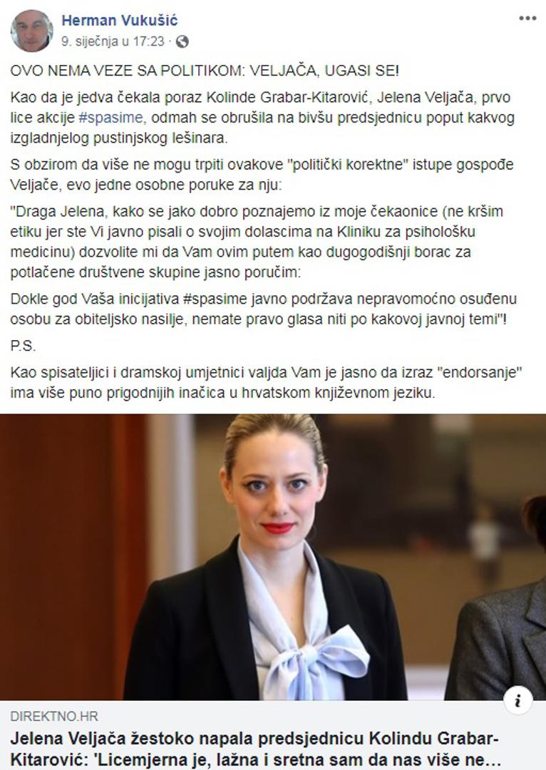 Nakon što je scenarista Jelena Veljača u Facebook statusu napala uskoro bivšu predsjednicu Kolindu Grabar Kitarović koja je izjavila kako se planira baviti zaštitom slabijih, promicanjem zaštite od nasilja nad ženama i djecom, a nije željela pomoći inicijativi #spasi me, priča je dobila i novog aktera. Naime, poznati hrvatski psihijatar Herman Vukušić koji je na Facebooku napisao: