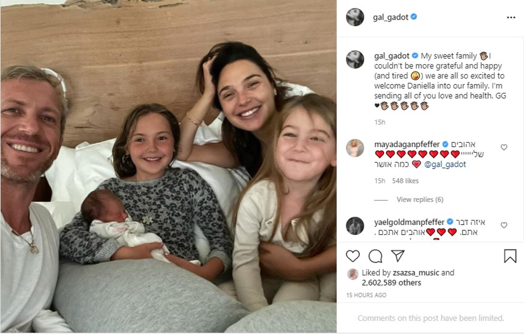 Glumica Gal Gadot (36) rodila je svoje treće dijete, a sretnu vijest podijelila je na Instagramu. Popularna Wonder Woman objavila je obiteljsku fotografiju sa suprugom i kćerima, a jedna od njih drži sestricu u rukama.