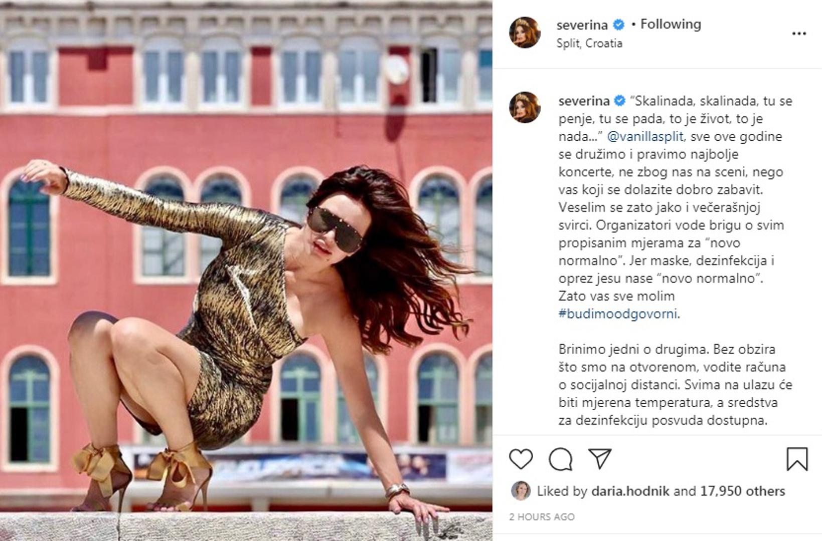 Severina večeras nastupa u Splitu nakon dugo vremena i tome se posebno veseli. Koncert je najavila na Instagramu, a fanovima je poslala upozorenje da posebno moraju paziti na epidemiološke mjere. premda se koncert održava na otvorenom.