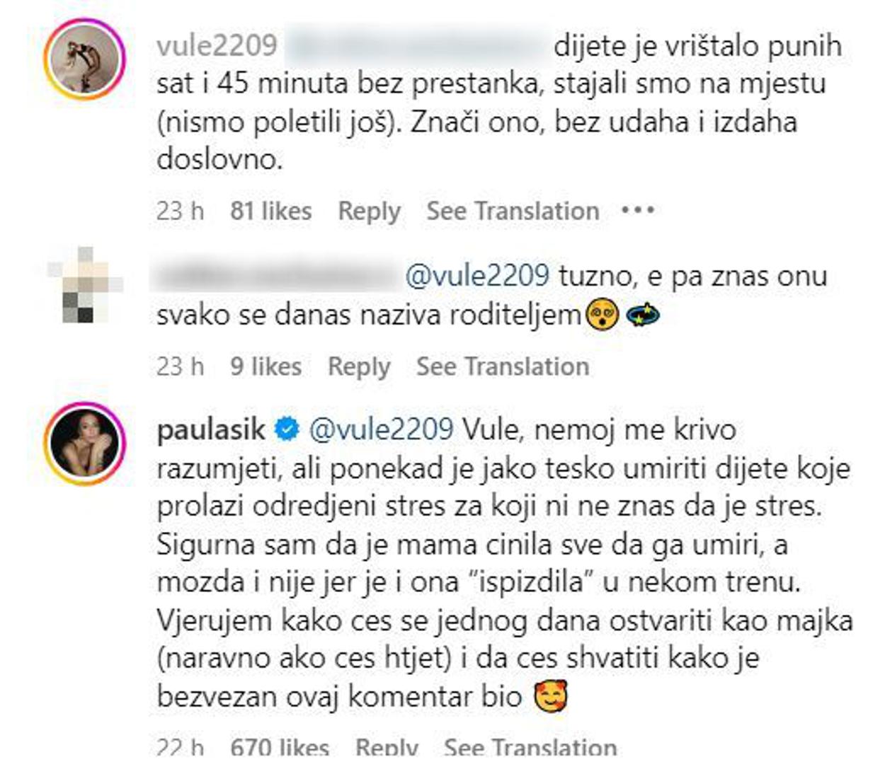 Influencerica Paula Sikirić, koja je i sama postala majka, javila joj se komentarom: - Vule, nemoj me krivo razumjeti, ali ponekad je jako teško umiriti dijete koje prolazi određeni stres za koji ni ne znaš da je stres. Sigurna sam da je mama činila sve da ga umiri, a možda i nije jer je i ona “ispizdila” u nekom trenu. Vjerujem kako ćeš se jednog dana ostvariti kao majka (naravno ako ćeš htjet) i da ćeš shvatiti kako je bezvezan ovaj komentar bio - napisala joj je, a s njom se složila i glazbenica Ivana Kindl koja je na njezin komentar napisala: - Potpuno potpisujem od a do ž. Ja vjerujem da se mama preznojila od muke jer ovakve situacije nikome nisu drage. Ni tom djetetu ni mami ni okolini.