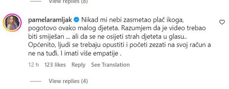 Uz njih, javila joj se i pjevačica Pamela Ramljak, koja joj je napisala: - Nikad mi ne bi zasmetao plač ikoga, pogotovo ovako malog djeteta. Razumijem da je video trebao biti smiješan ... ali da se ne osjeti strah djeteta u glasu.. Općenito, ljudi se trebaju opustiti i početi zezati na svoj račun a ne na tuđi. I imati više empatije.