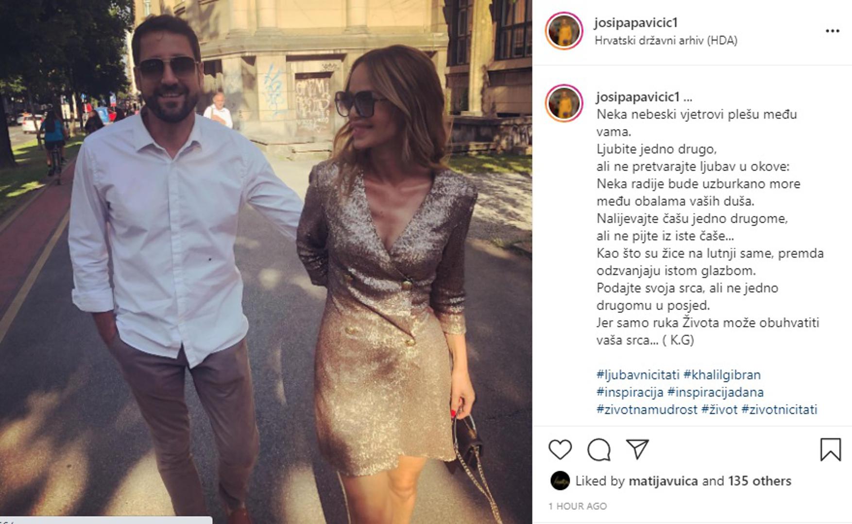 Bivša TV voditeljica Josipa Pavičić ne krije koliko je sretna u ljubavi sa zagrebačkim ginekologom Markom Kisićem. Iako o svom privatnom životu ne voli pretjerano govoriti u medijima, na svom Instagramu profilu s vremena na vrijeme objavi fotografiju sa svojim odabranikom. Na posljednjoj fotografiji koja stoji na njezinom profilu Josipa i Marko poziraju besprijekorno sređeni u centru Zagreba. Uz fotografiju je napisala i citat poznatog pjesnika Kahlila Gibrana o ljubavi.