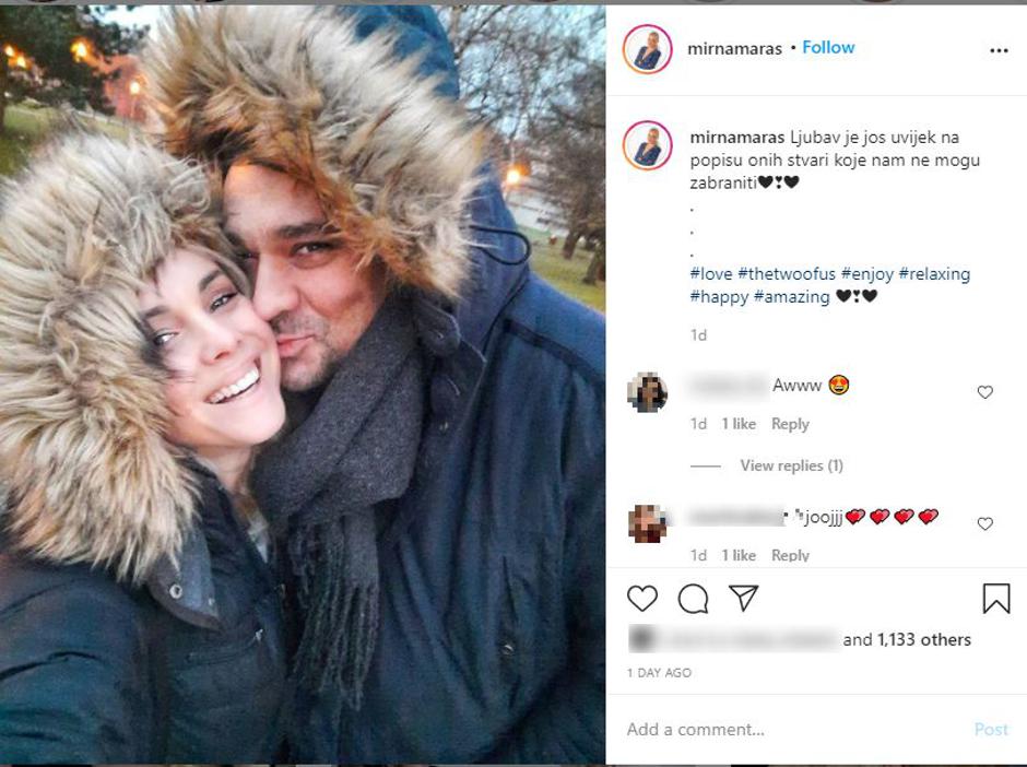 "Ljubav je još uvijek na popisu onih stvari koje nam ne mogu zabraniti", napisala je Mirna uz fotografiju na kojoj je muž grli i ljubi u obraz, a pratitelji su raznježeno komentirali.