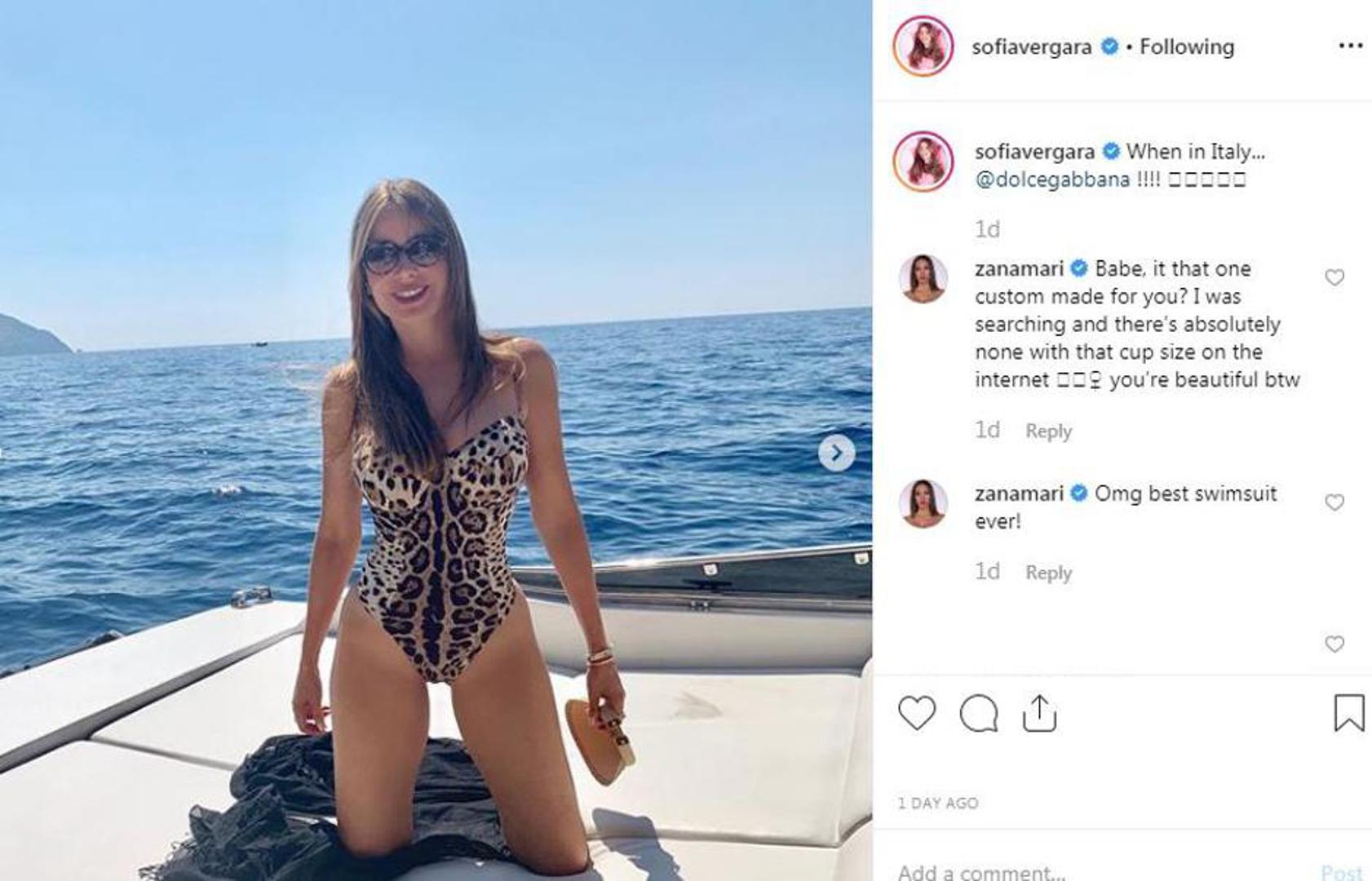 Naime, pjevačica je na Instagramu komentirala fotografije na kojima je Vergara u jednodijelnom kupaćem kostimu s leopardovim uzorkom modne kuće Dolce&Gabbana koji stoji oko 3660 kuna.