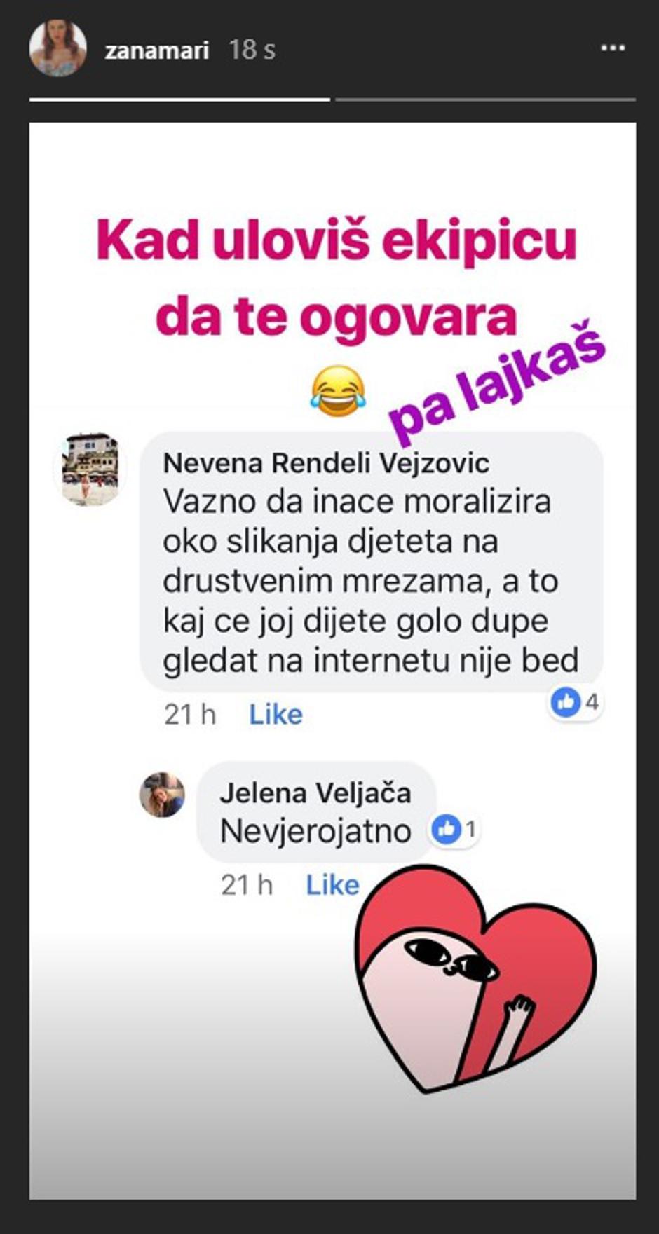 – Važno da inače moralizira oko slikanja djeteta na društvenim mrežama, a to kaj će joj dijete golo dupe gledati na internetu, nije bed – bio je komentar Nevene Rendeli Vejzović, a Jelena Veljača je dodala: ''Nevjerojatno.''