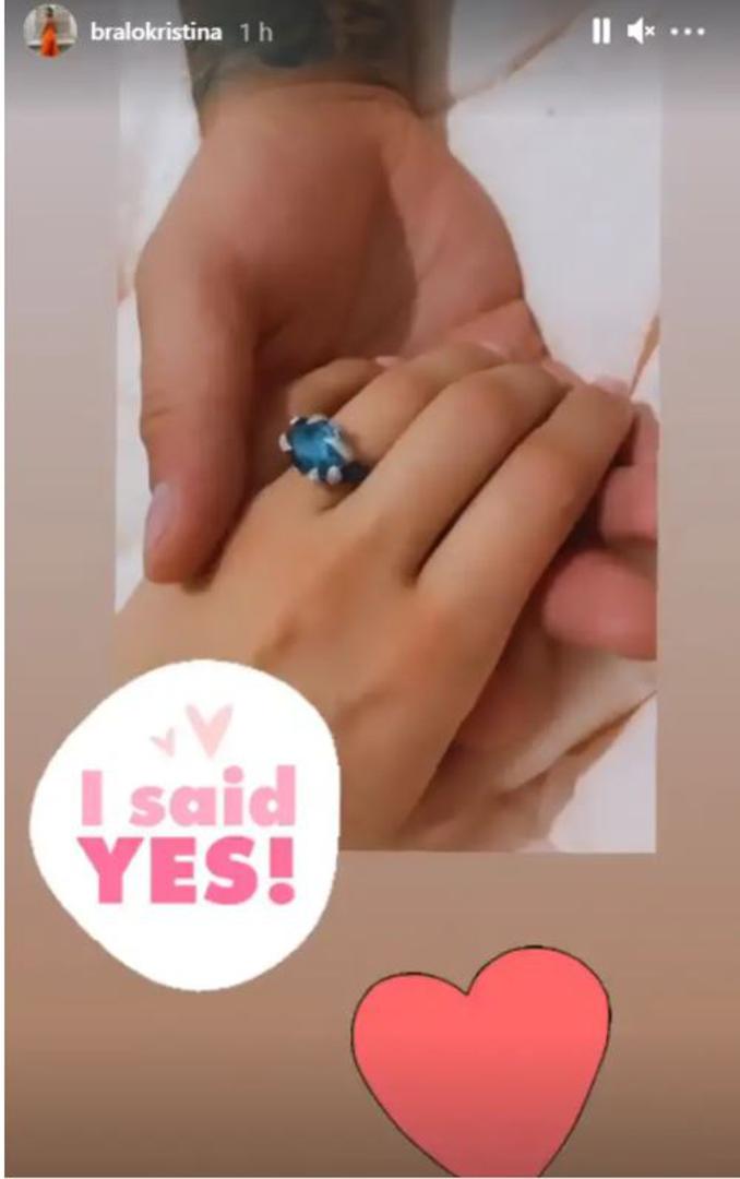 Pjevačica Kristina Bralo (28), bivša djevojka Davora Šukera na Instagramu je objavila da se zaručila za Mateja Cvitanovića (27). U Storyjima je objavila sliku svoje ruke na kojoj je prsten, te dodala status: ''Rekla sam da''.