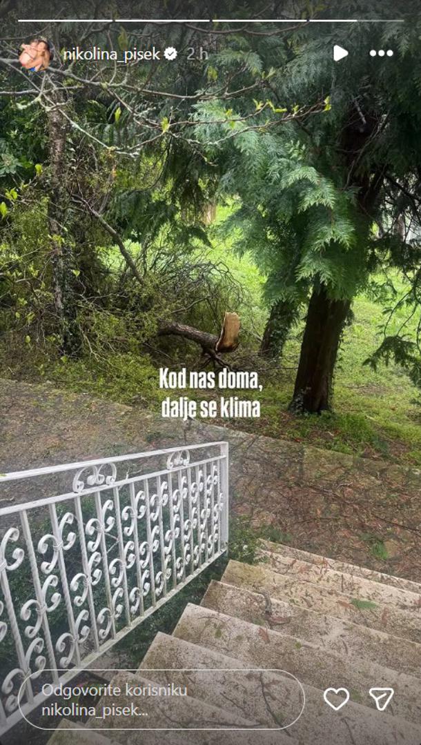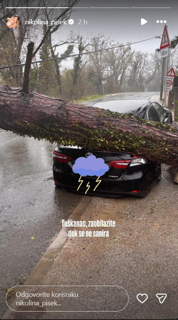 Posljedice nevremena bile su brutalne. Na jednoj od fotografija koje je Pišek objavila vidi se crni Mercedes na koji se srušilo stablo, potpuno ga uništivši. Prizor smrskanog automobila na Tuškancu bio je dovoljan da voditeljica uputi još jedno upozorenje građanima: "Tuškanac, zaobilazite dok se ne sanira". Kaos se nije zaustavio na ulici; oluja je ostavila traga i u njezinu vlastitom dvorištu. Fotografije porušenih stabala svjedočile su o snazi vjetra, a uz njih je kratko napisala: "Kod nas doma, dalje se klima", dajući do znanja da opasnost još uvijek nije prošla i da se situacija može dodatno pogoršati.