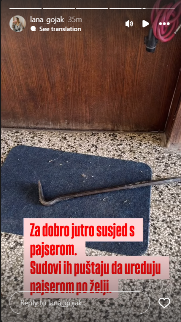 – Živimo pod stresom. Ne znamo hoće li nas čovjek zapaliti, pobiti, razbiti. Moj prvi susret s njim je bio prije nekoliko godina kada mi je prijetio da će me zaklati na stubištu... – izjavila je Lana dok ju je u pozadini prekinulo zvono na vratima.