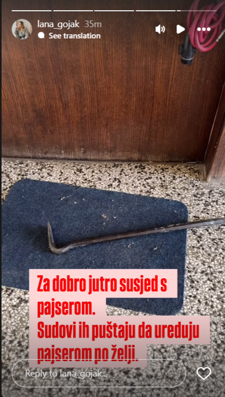 Hrvatska glumica Lana Gojak Bajt putem društvenih mreža podijelila je uznemirujuće iskustvo koje proživljava u vlastitom domu. U emotivnom i dramatičnom videu objavljenom na Instagramu, vidno potresena ispričala je kako se osjeća zatočeno u svom stanu, dok joj ispred vrata stoji prvi susjed s pajserom u rukama. Kako je istaknula, riječ je o osobi koja već godinama terorizira stanare zgrade unatoč brojnim prijavama policiji i socijalnim službama.