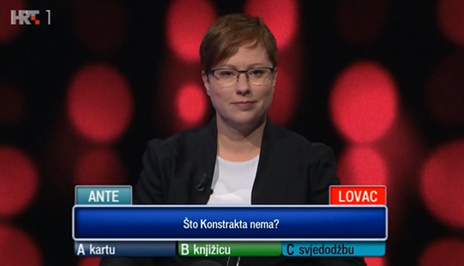 Ponuđeni odgovori su bili - karta, knjižica i svjedodžba, a natjecatelj Ante ostao je pomalo zbunjen kad je na ploči ugledao pitanje. Na kraju je odgovorio 'svjedodžba' i fulao točan odgovor koji je glasio 'knjižica' jer Konstrakta u pjesmi s kojom ide na Euroviziju spominje zdravstvenu iskaznicu koju, kako je i sama priznala u pjesmi, nema.