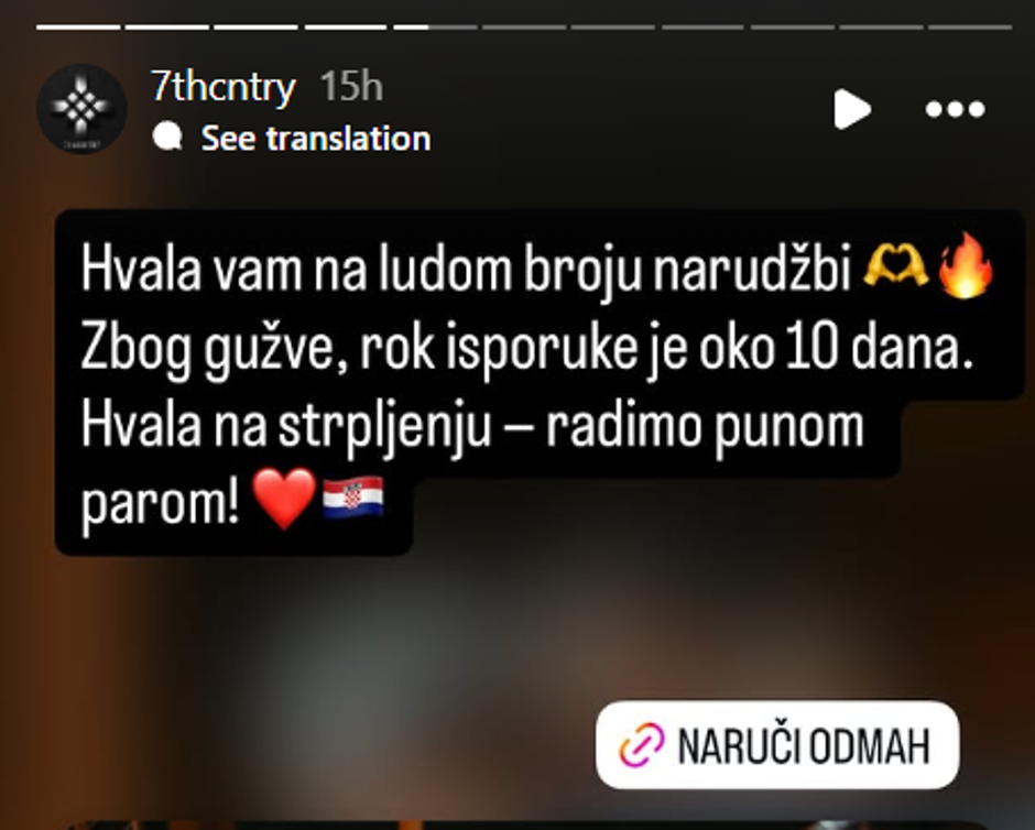 "Hvala vam na ludom broju narudžbi. Zbog gužve, rok isporuke je oko 10 dana. Hvala na strpljenju - radimo punom parom!", poručili su uz fotografiju Marka Perkovića s dočeka naših rukometaša. Ovaj mladi hrvatski brend sebe definira kao premium streetwear namijenjen Hrvatima diljem svijeta. Ističu kako kombiniraju vrhunske materijale s odvažnim dizajnom nadahnutim tradicijom, pozivajući kupce da s ponosom nose svoje korijene. Trenutačni asortiman im je skroman i obuhvaća tek nekoliko predmeta - kapu, jaknu, majicu s kapuljačom te dva modela majica kratkih rukava.