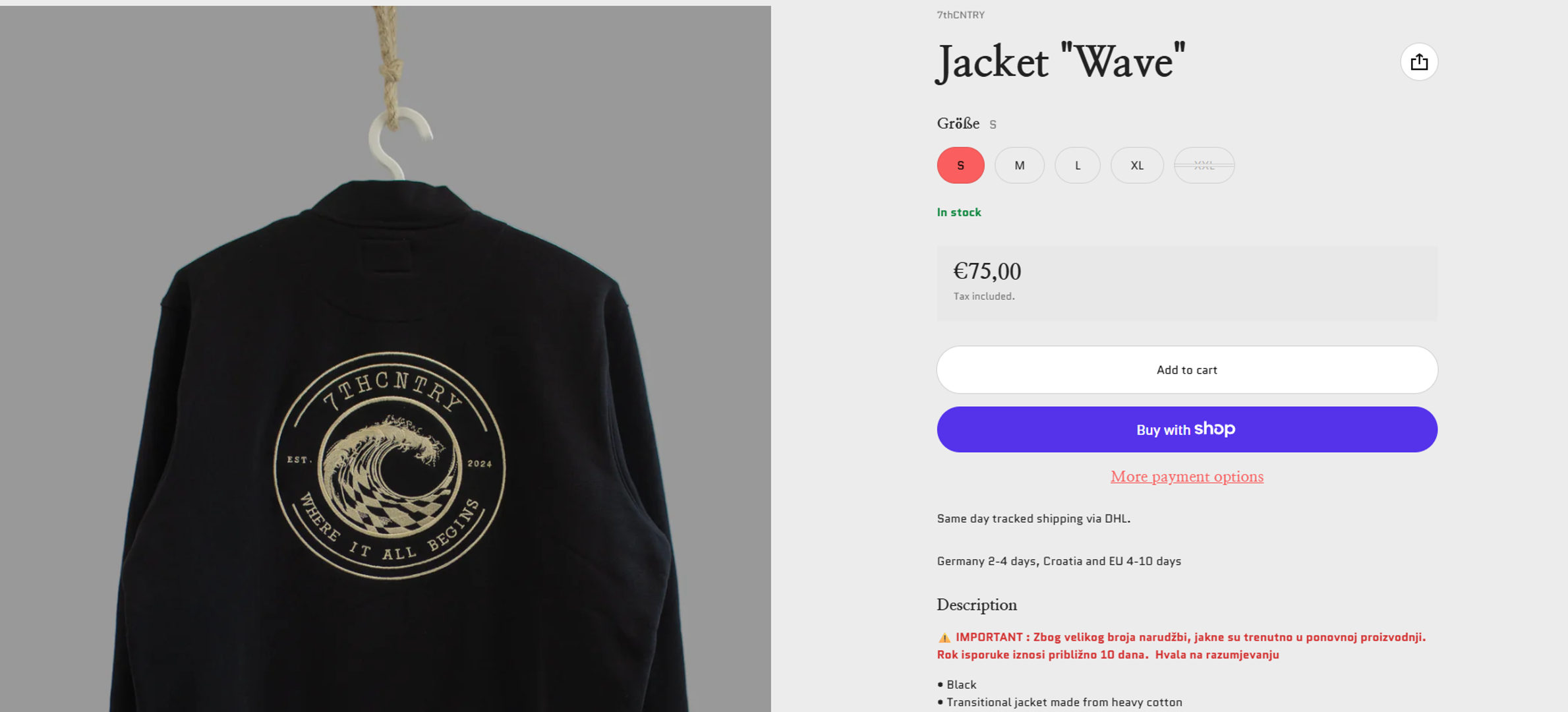 Radi se o modelu Wave domaćeg brenda 7thCNTRY. Na njihovim stranicama stoji kako je riječ o prijelaznoj jakni izrađenoj od teškog pamuka, s kopčanjem na gumbe, diskretnim logotipom sprijeda te upečatljivom grafikom vala na leđima. Cijena jakne iznosi 75 eura, a nudi se u veličinama od S do XL. Iz brenda su se putem Instagram Storyja pohvalili izvrsnom prodajom upravo zbog Thompsonova utjecaja.