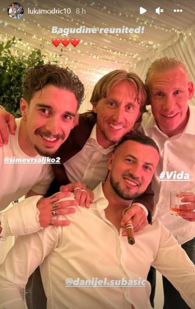 Podsjetimo, na zadarsko vjenčanje Livakovića stigli su i njegovi kolege iz reprezentacije, a atmosferom sa slavlja pohvalio se i Luka Modrić koji je na svom Instagram Storyju objavio fotografiju sa suigračima iz reprezentacije. Modrić je tako otkrio da se odlično zabavljao u društvu Šime Vrsaljka, Domagoja Vide i Danijela Subašića. "Bagudine reunited", napisao je Modrić u opisu fotografije na kojoj je pozirao sa zapaljenom kubankom dok je Vida nazdravljao uz čašicu žestokog pića. Brojne goste zabavljali su Saša Matić i Petar Grašo.
