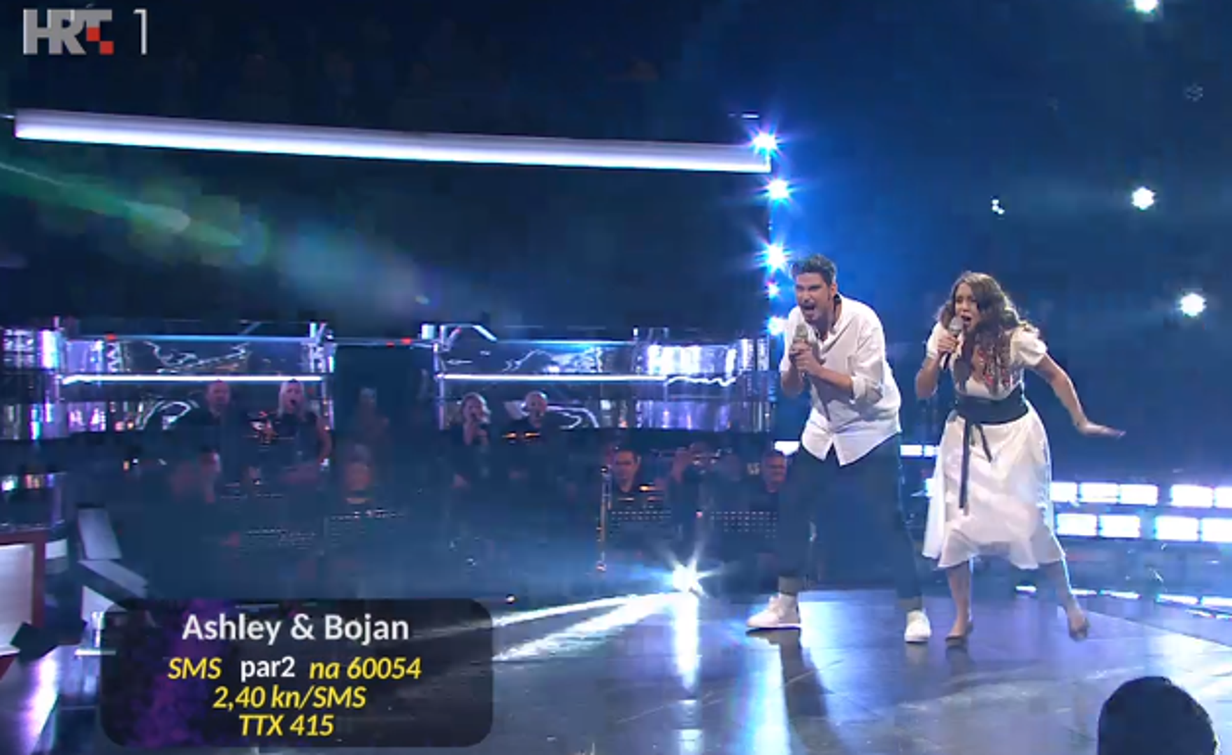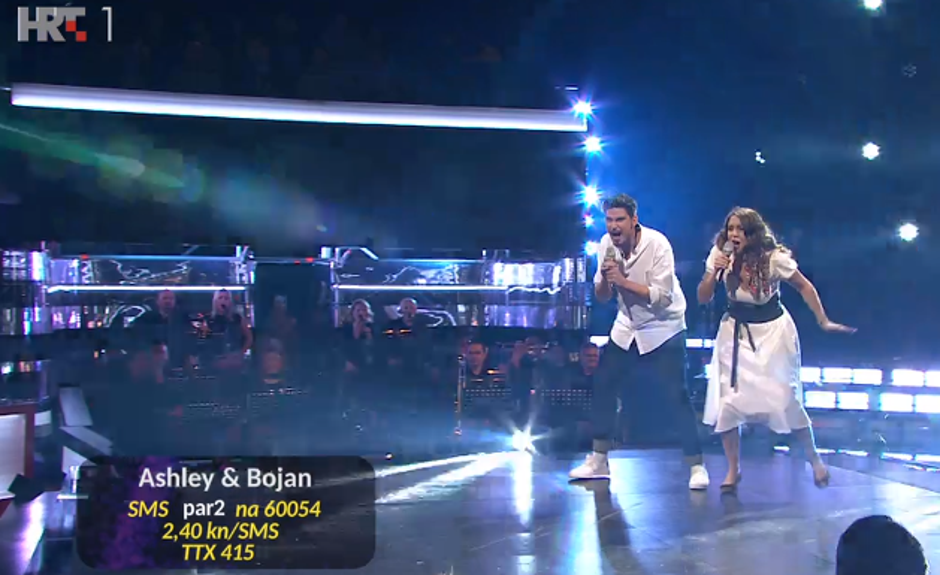 20:40 Potom su Ashley Colburn i Bojan Jambrošić u 'mjuzikl' stilu pokorili pozornicu s englesko hrvatskom verzijom 'Footloosea'. U čast Ashleynom sudjelovanju u emisiji u publici je sjedio i američki veleposanik Robert Kohorst.