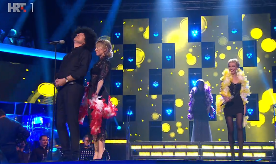 21:46 Dok se prebrojavaju glasovi na stage su se popeli članovi žirija i otpjevali 'Daddy Cool' Boney M-a.