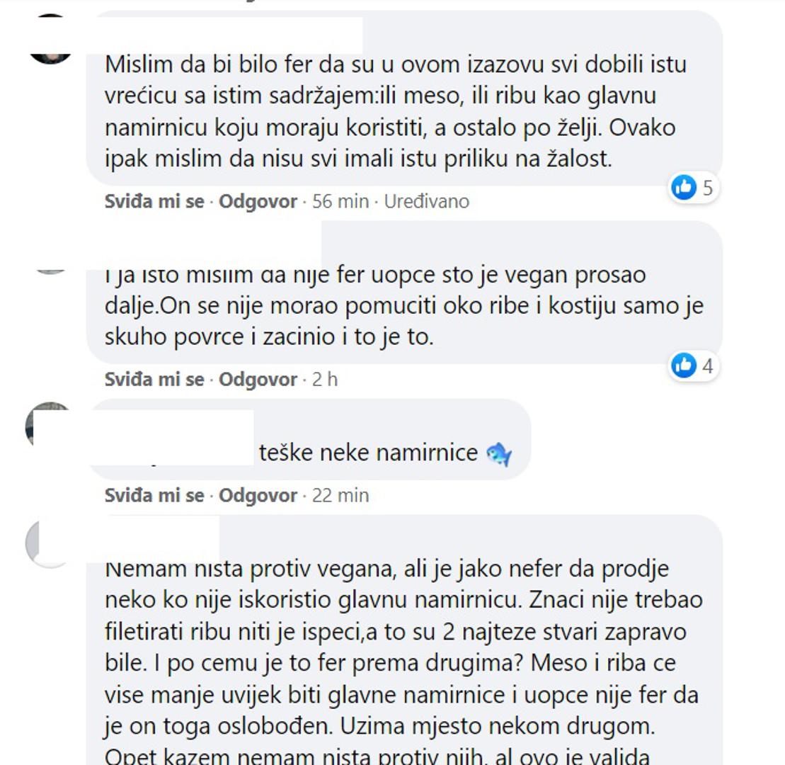 "Mislim da bi bilo fer da su u ovom izazovu svi dobili istu vrećicu sa istim sadržajem: ili meso ili ribu kao glavnu namirnicu koju moraju koristiti, a ostalo po želji. Ovako ipak mislim da nisu svi imali istu priliku, nažalost", piše u jednom komentaru na službenom Facebooku.