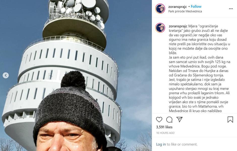 "Ja sam, eto, prvi put ikad, ovih dana sam samcat, iznio svih svojih 125 kilograma na vrhove Medvednice, Bogu pod noge. Nekidan od Trnave do Hunjke, a danas od Gračana do Sljemenskog tornja. Jest, trajalo je satima i nije izgledalo nimalo spektakularno. Dok sam ja uspuhano stenjao, mnogi su kraj mene prema vrhu prolazili laganim trkom", napisao je i nastavio: