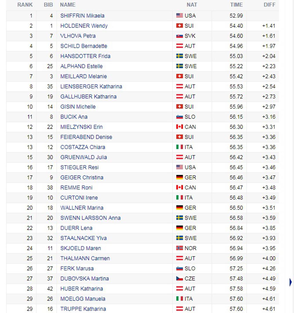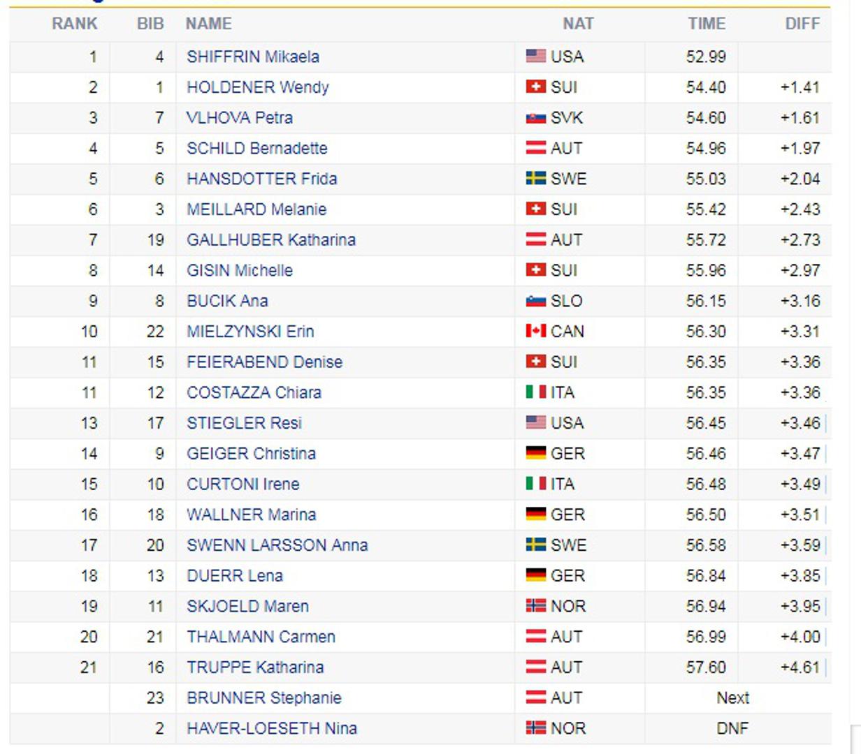 U utrci slalomašica nastupile su i dvije hrvatske predstavnice, 20-godišnja Leona Popović je sa 7.03 sekunde zaostatka za Shiffrin zauzela 47. mjesto, dok 17-godišnja Ida Štimac u svom debiju u Svjetskom kupu nije uspjela doći do cilja.