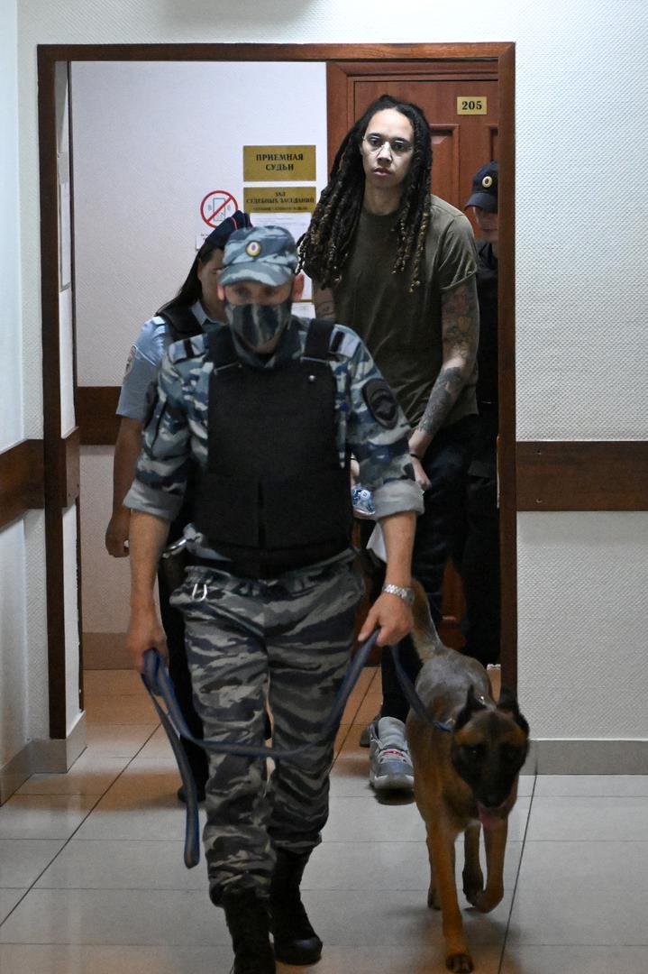 U.S. basketball player Brittney Griner, who was detained at Moscow's Sheremetyevo airport and later charged with illegal possession of cannabis, is escorted before a court hearing in Khimki outside Moscow, Russia August 2, 2022. Natalia Kolesnikova/Pool via REUTERS Photo: POOL/REUTERS
