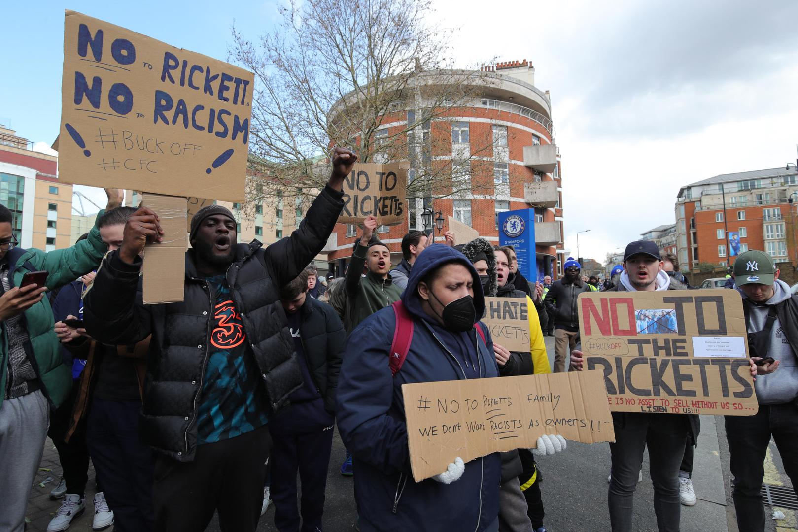 Soccer Football - Premier League - Chelsea v Brentford - Stamford Bridge, London, Britain - April 2, 2022 Chelsea fans display banners in protest of potential owners, the Ricketts family, the owners of the Chicago Cubs outside the stadium before the match REUTERS/Chris Radburn EDITORIAL USE ONLY. No use with unauthorized audio, video, data, fixture lists, club/league logos or 'live' services. Online in-match use limited to 75 images, no video emulation. No use in betting, games or single club /league/player publications. Please contact your account representative for further details. Photo: Chris Radburn/REUTERS