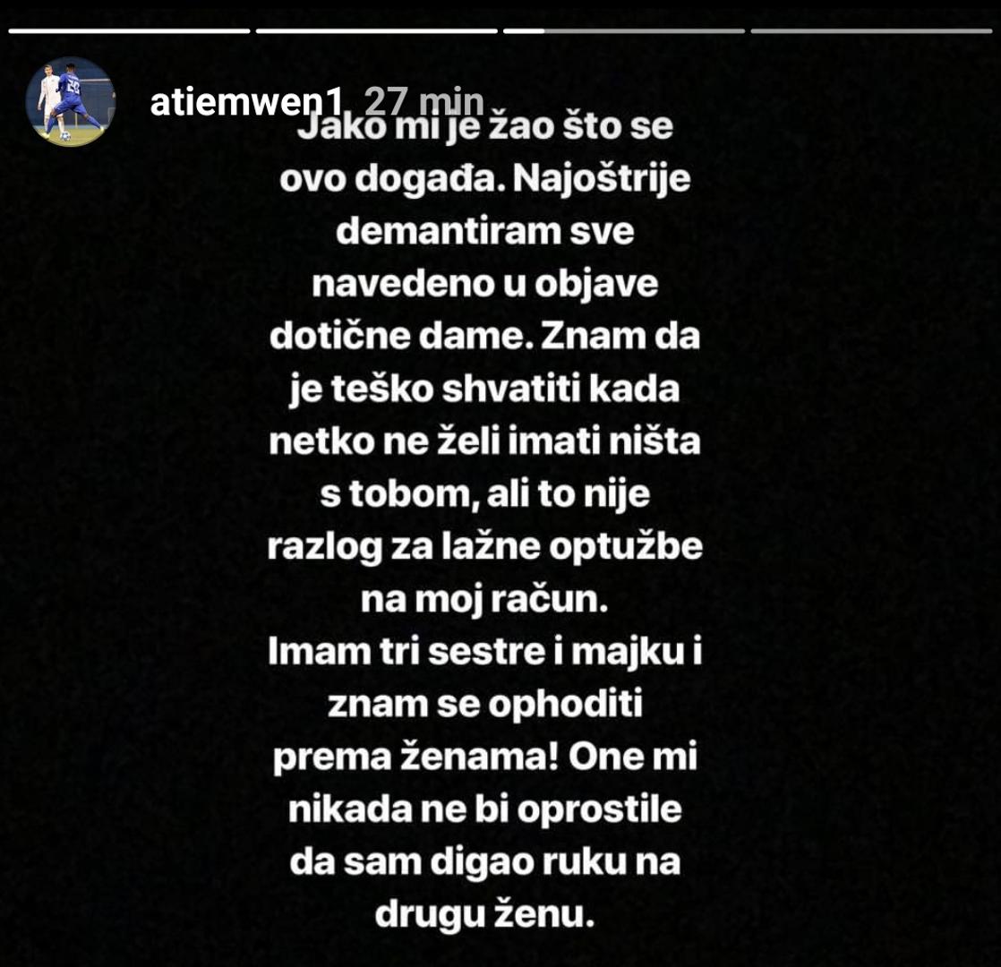 Iyayi Believe Atiemwen, Dinamov nogometaš kojeg je djevojka Iva Bošnjak optužila da ju je napao i gušio nakon utakmice s Benficom,  oštro je demantirao da je na nju podigao ruku.