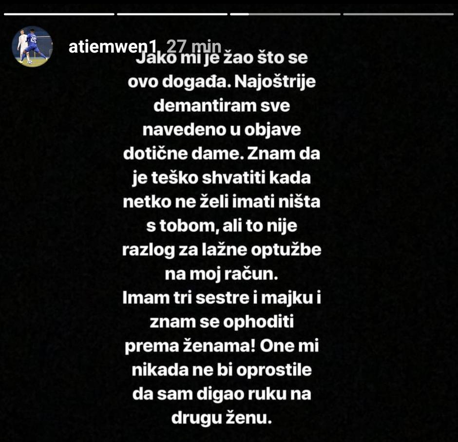 - Jako mi je žao što se ovo događa. Demantiram sve navedeno u objavama dotične dame. Znam da je teško shvatiti kada netko ne želi imati ništa s tobom, ali to nije razlog za lažne optužbe na moj račun. Imam tri sestre i majku i znam se ophoditi prema ženama! One mi nikada ne bi oprostile da sam digao ruku na drugu ženu - napisao je na svom profilu na Instagramu.