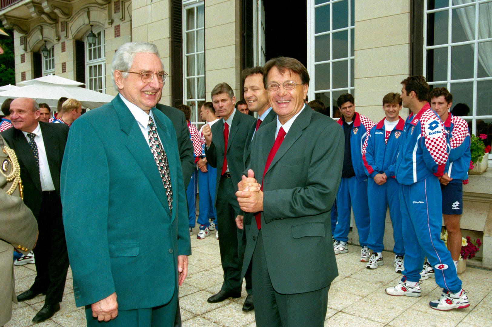 08.07.1998., Chateau de Chantilly, Francuska - Predsjednik RH dr. Franjo Tudjman dosao bodriti hrvatsku nogometnu reprezentaciju uoci polufinalne utakmice Hrvatska-Francuska. Na slici s izbornikom Miroslavom Cirom Blazevicem. "nPhoto: Sinisa Hancic/PIXSELL
