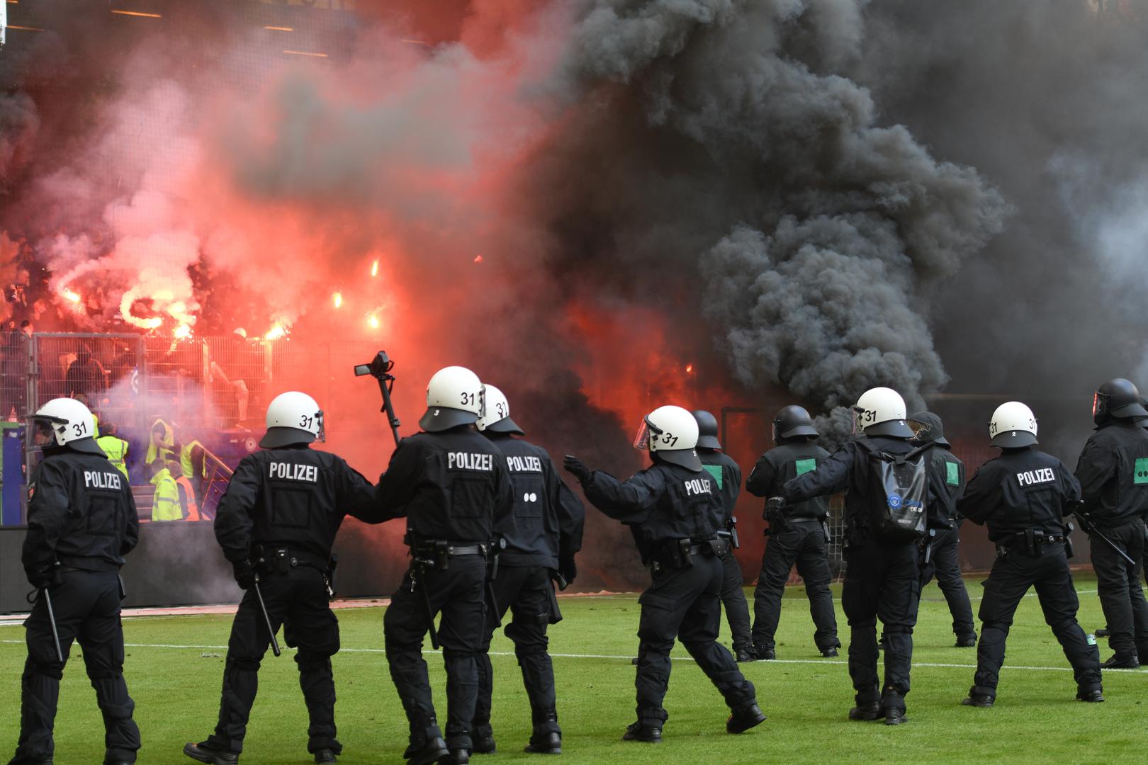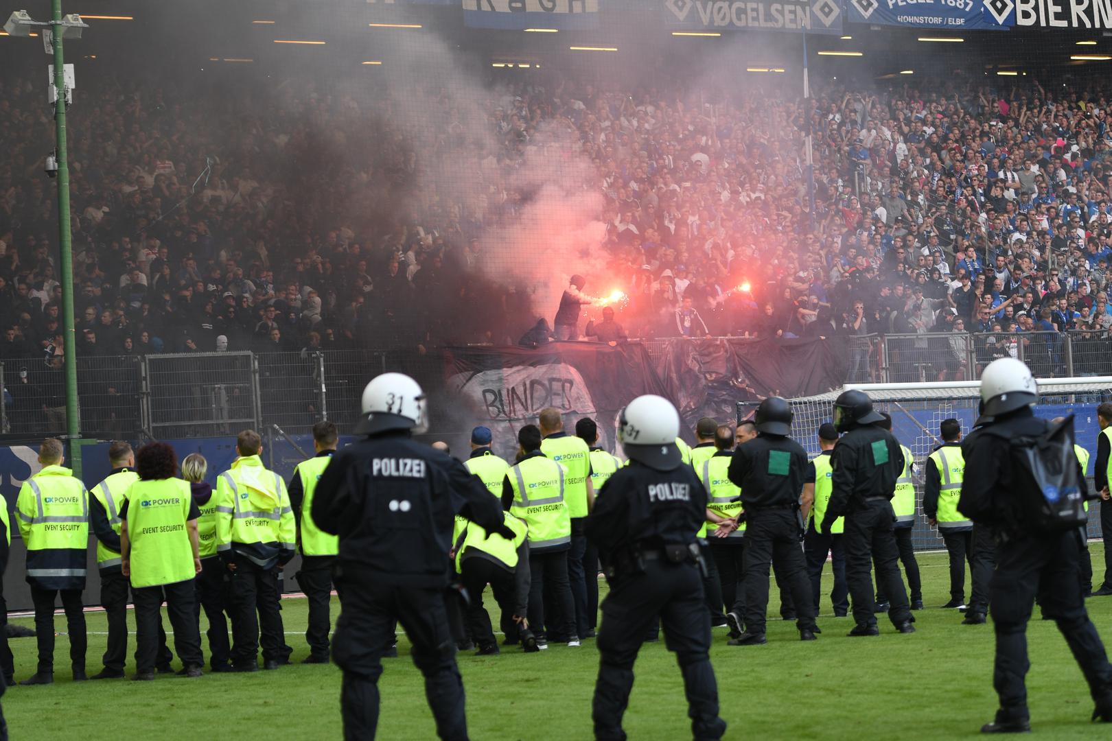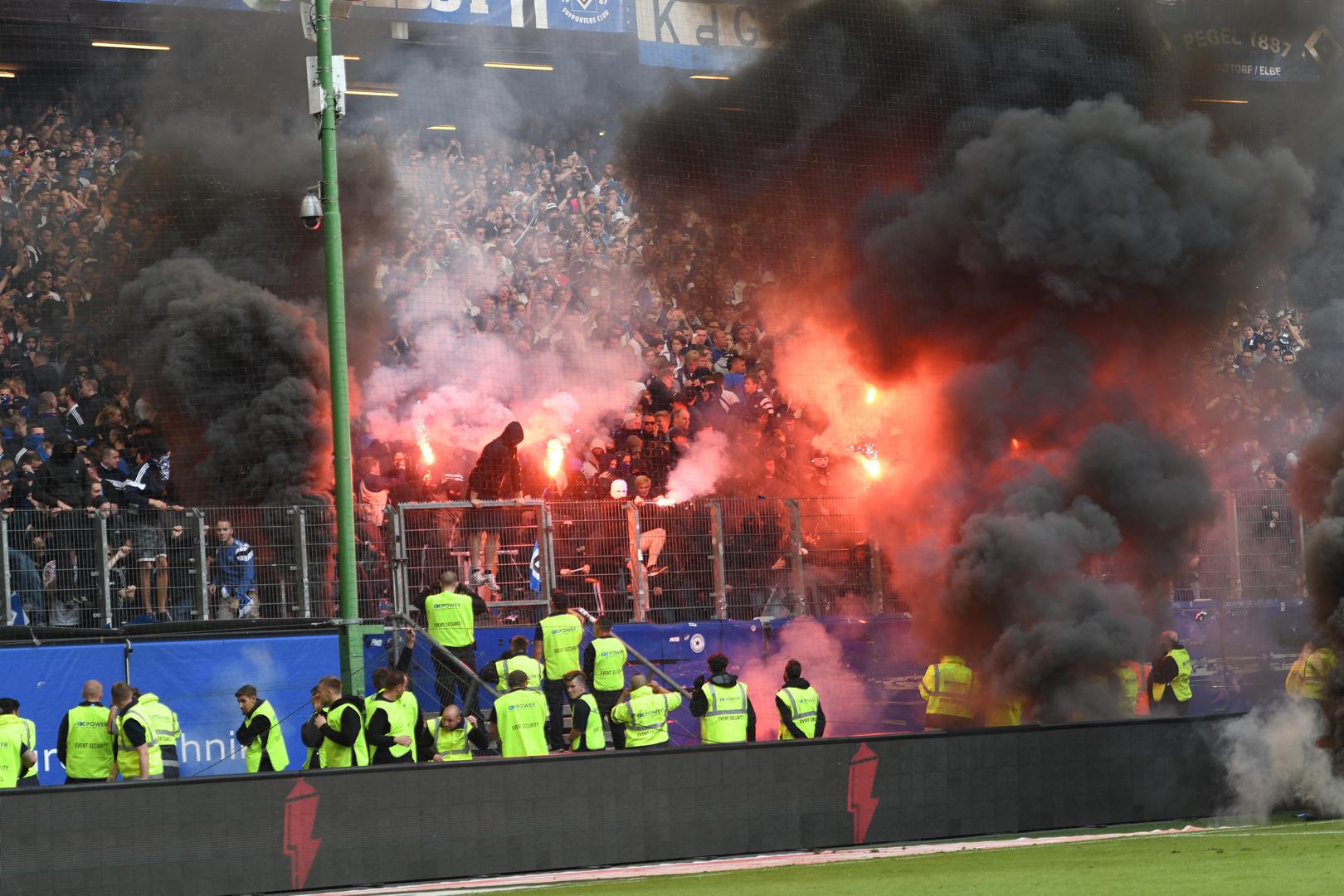 Naime, navijači se nisu mogli pomiriti s ispadanjem te su na teren počeli bacati baklje i dimne bombe.