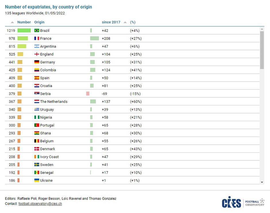 CIES donosi 80 nogometnih saveza čiji su igrači u 135 liga diljem svijeta. Brazil predvodi tu grupu sa 1.219 nogometnih iseljenika, a slijedi ga Francuska (978) pa Argentina (815).