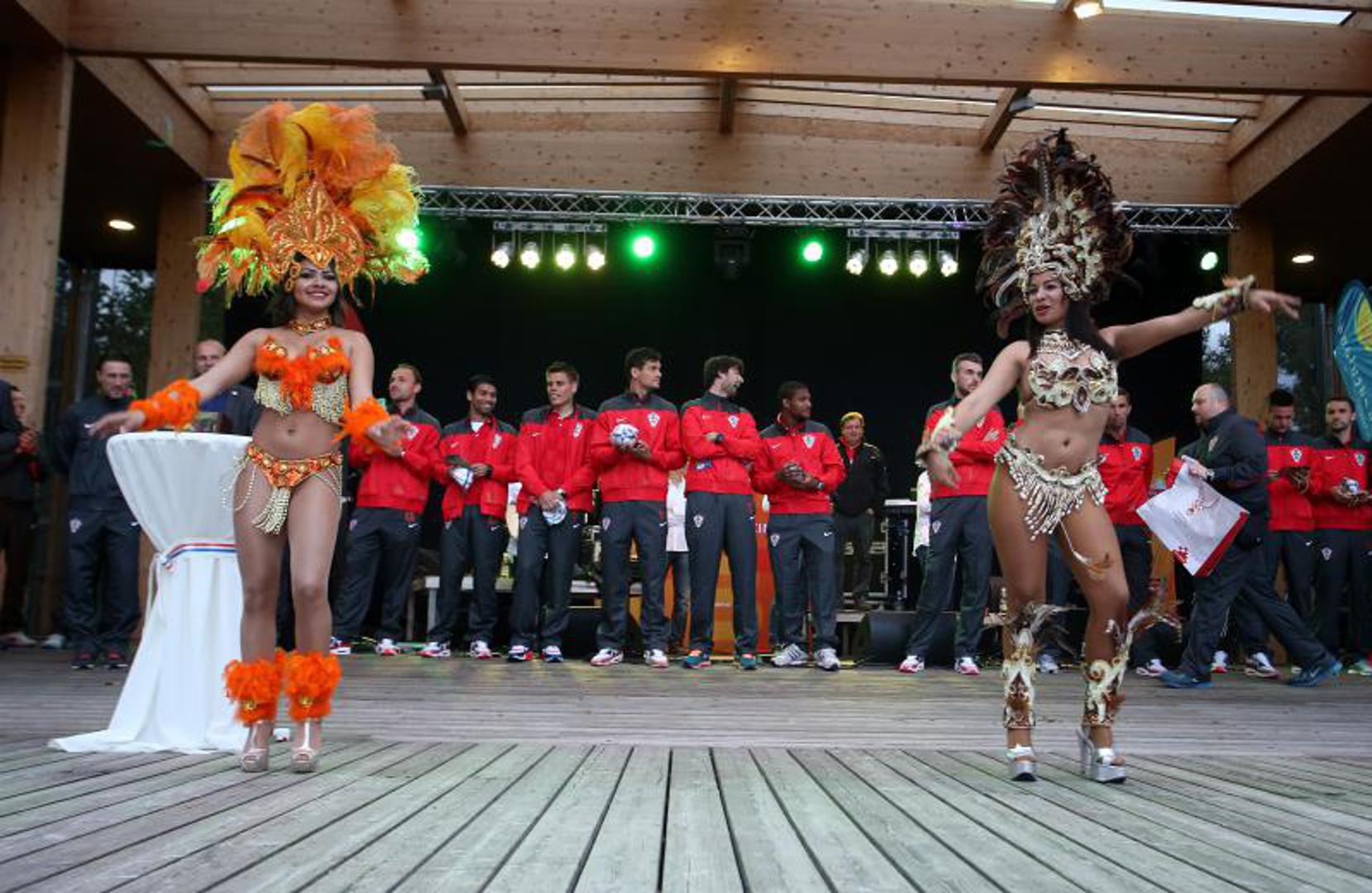 Bilo je tu puno hrvatskih zastava, a domaćini su naše igrače odlučili iznenaditi s dvije brazilske plesačice koje su ispred igrača zaplesale sambu.