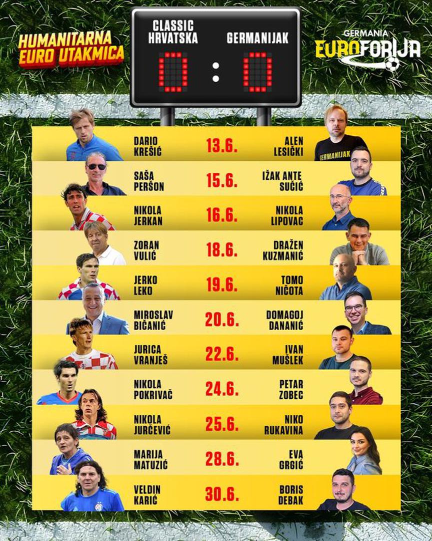 Dok ćemo svi s velikim uzbuđenjem pratiti Europsko prvenstvo, Germania će u okviru svojeg kultnog humanitarnog listića okupiti dvije postave humanitaraca u borbi za donacije. Tim Classic Hrvatska čine 11 bivših reprezentativaca, a njihovi prognozerski protivnici bit će 11 eksperata Germanije. Njihove listiće i ti ćeš moći odigrati OVDJE.