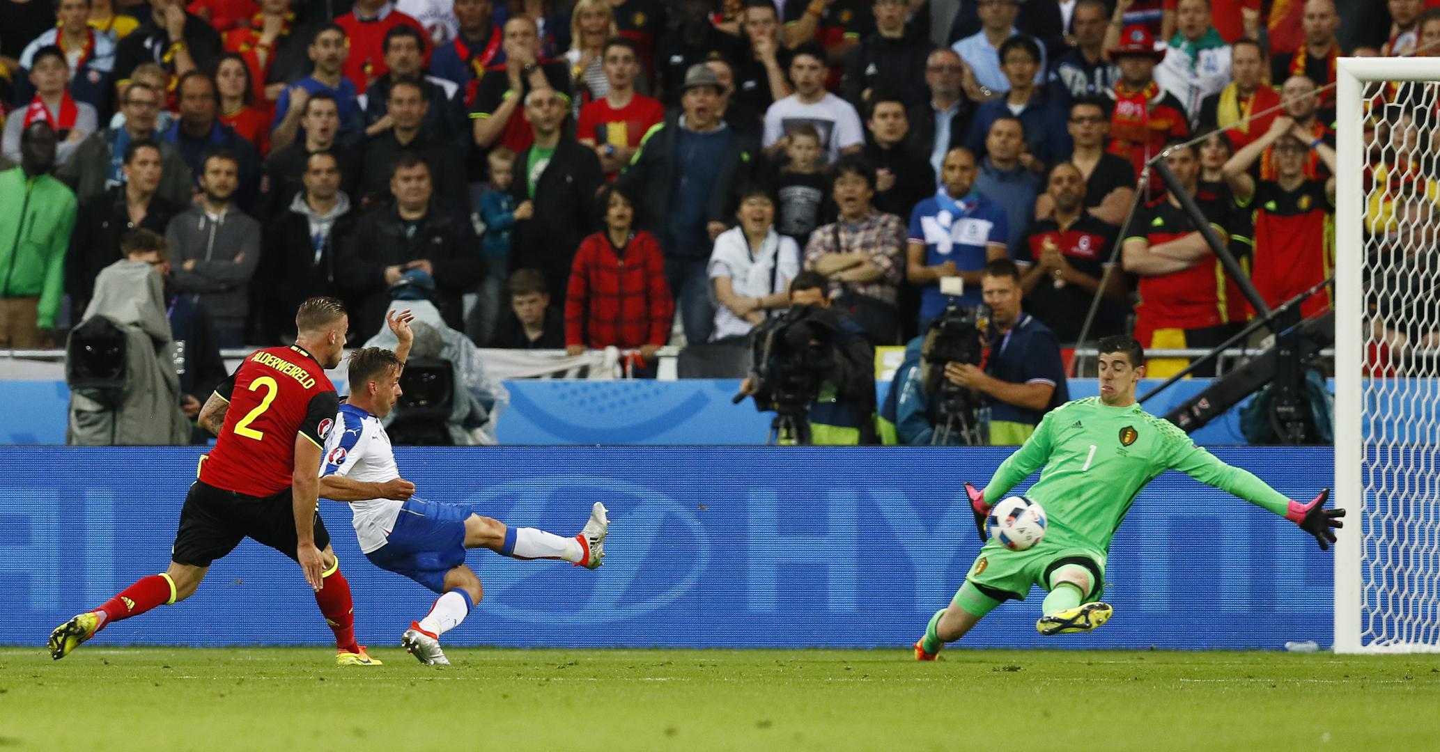 Belgija je bila favorit, barem na papiru, tako se i postavila na početku i napala, ali to je djelovalo prilično mlako pa su im čvrsti Talijani bez problema zatvorili sve prilaze vratima. Italija se prvih pola sata jako dobro branila i čekala pravu priliku, a onda je Bonucci pokrenuo kontru, a Giaccherini iskoristio pogrešku Alderweirelda i akciju okrunio pogotkom. U sljedeće tri minute Talijani su mogli dotući grogiranu Belgiju, inače drugu reprezentaciju svijeta, ali Candreva i Pelle nisu zabili iz dobrih situacija.