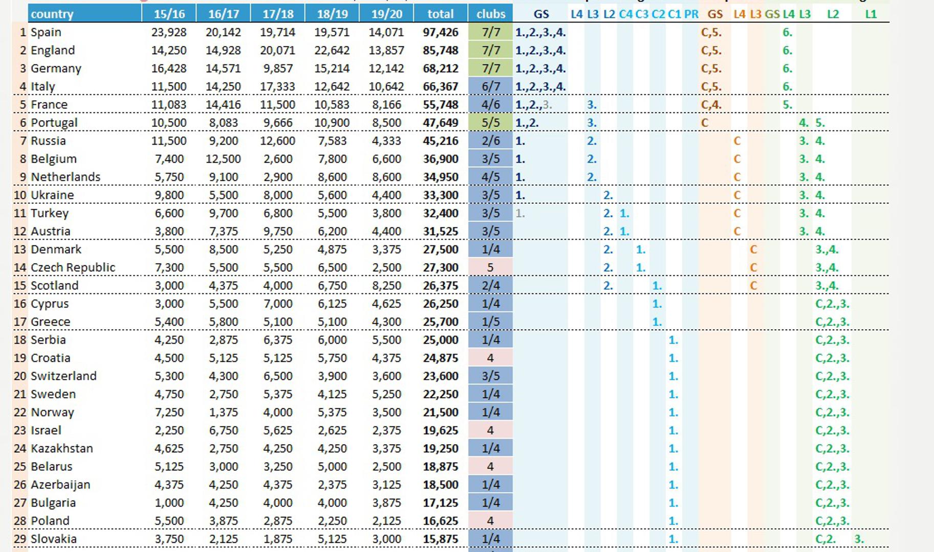 Hrvatska trenutačno na listi zauzima 19. mjesto, a vjerojatno će pasti za još koju poziciju jer niz država iza nas još uvijek ima poneki aktivan klub u nadmetanjima.