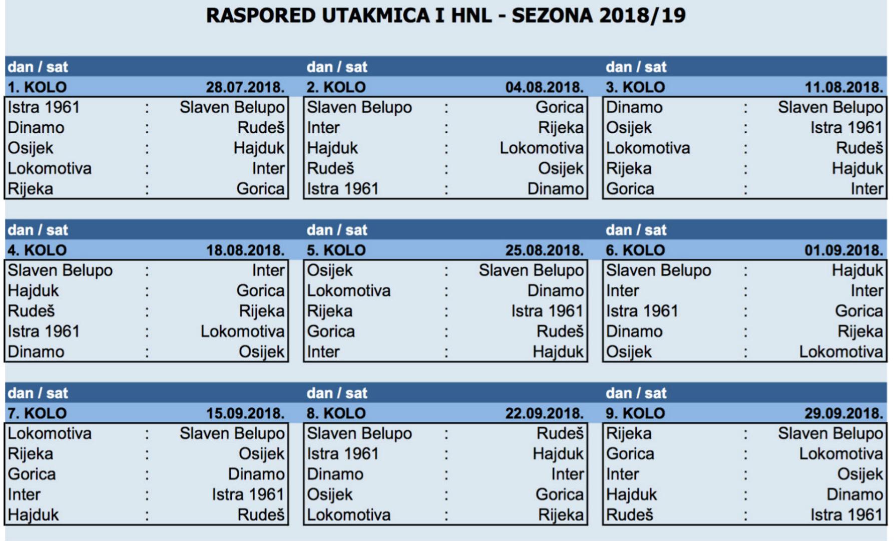 Splićani će imati težak početak sezone, Hajduk već u 3. kolu mora na Rujevicu, dok će se veliki derbi hrvatskog nogometa, dvoboj između Hajduka i Dinama odigrati u posljednjem devetom kolu.