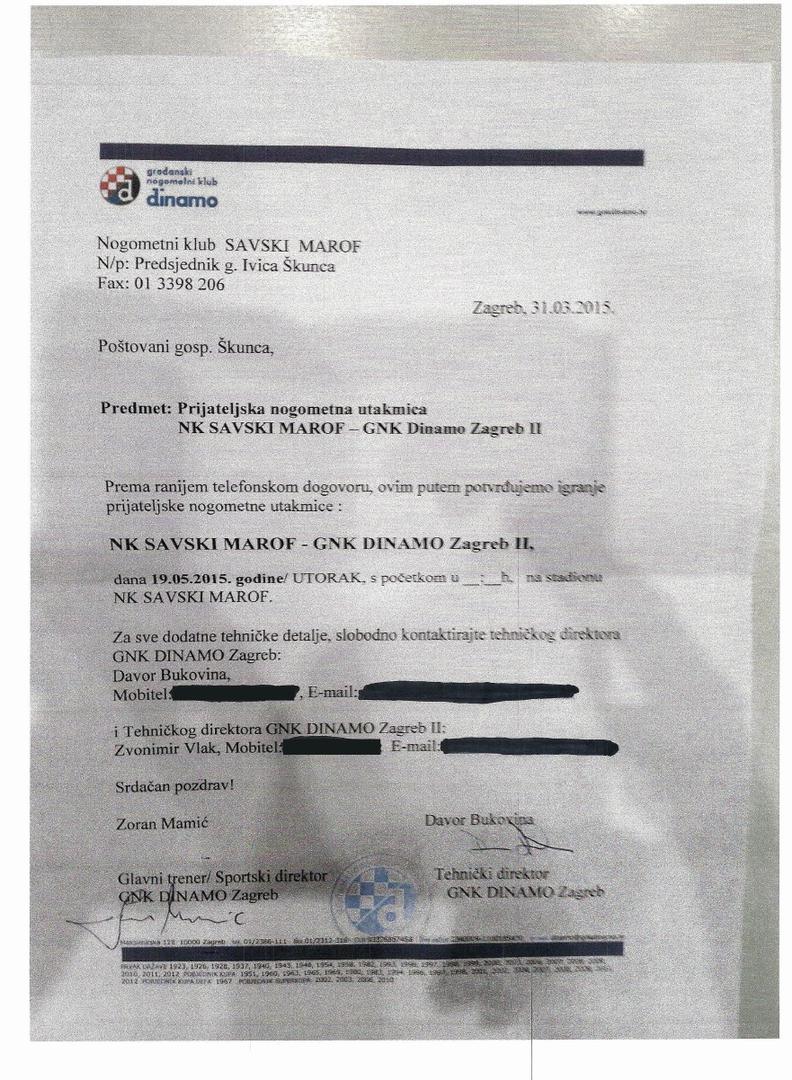 Dinamo ne samo da je odgovorio na molbu NK Savski Marof nego smo i dogovorili odigravanje prijateljske utakmice koju su domaćini dan prije susreta - otkazali. Čim smo primili poziv da dođemo uveličati rođendansku proslavu NK Savski Marof kontaktirali smo ih i dogovorili odigravanje utakmice u prvom idućem slobodnom terminu. Kao što se jasno vidi u priloženom dokumentu, 31. ožujka naš trener i sportski direktor Zoran Mamić potpisao je službeni dopis koji je poslan u NK Savski Marof kojim se potvrđuje odigravanje utakmice između domaćina i naše druge momčadi 19. svibnja iste godine.