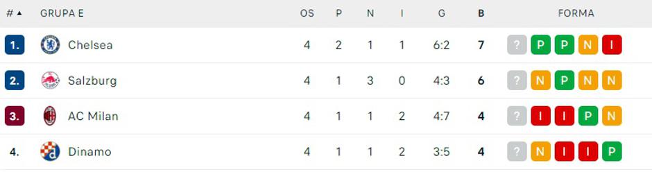 Vodeći u skupini je Chelsea sa sedam bodova, a slijede ga Salzburg sa šest bodova, zatim trećeplasirani Milan i četvrtoplasirani Dinamo s po četiri boda. Preostale dvije utakmice u skupini, koje ne računaju Dinamu, su Salzburg - Chelsea u ovom kolu te Milan - Salzburg u idućem.