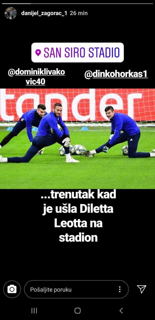 Čuvar mreže plavih ispod fotografije na kojoj se nalazi u društvu Livakovića i Horkaša napisao je: ''Trenutak kad je ušla Diletta Leotta na stadion.''