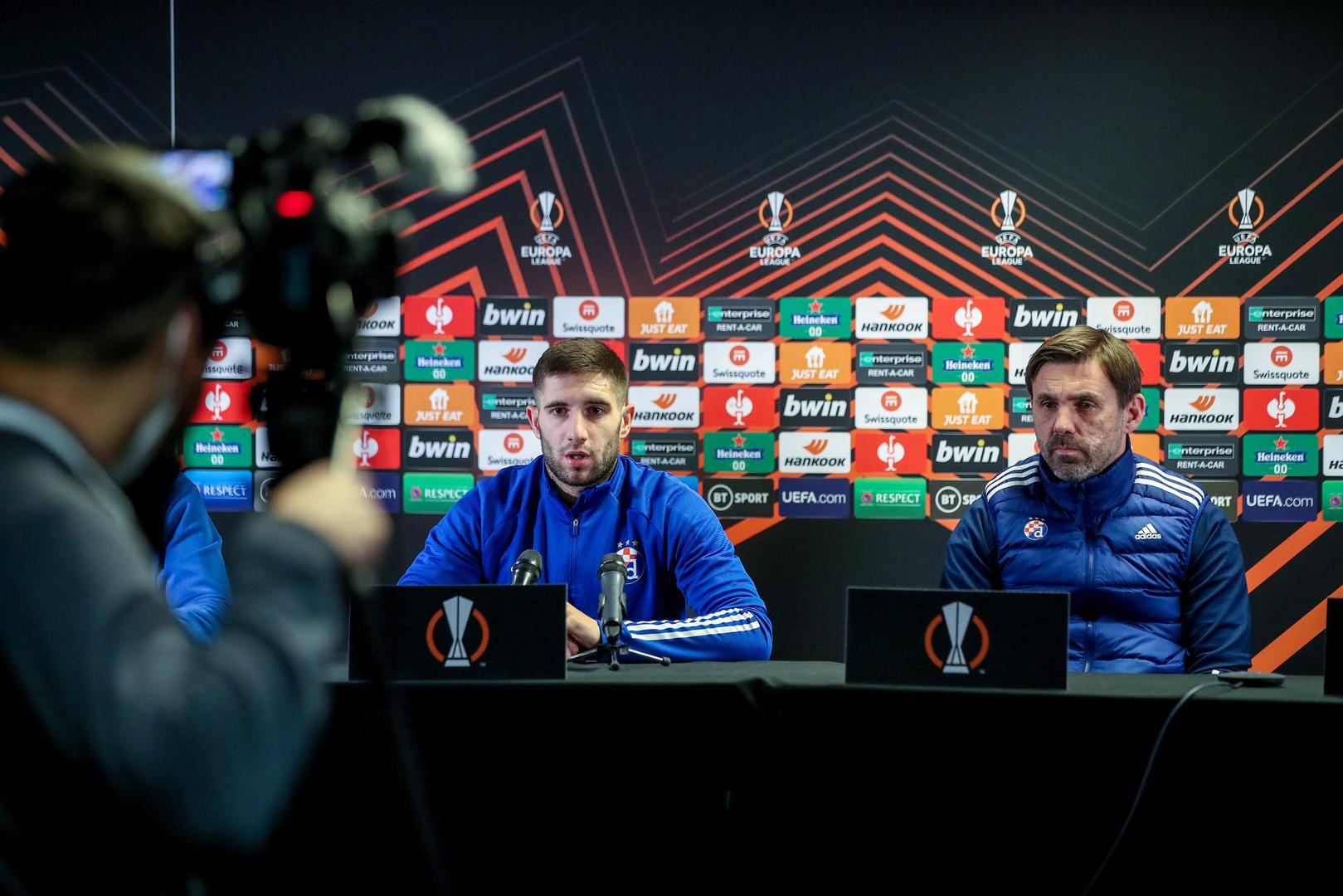 08.12.2021., London, Engleska - London Stadion, konferenciji za medije GNK Dinama uoci sutrasnje utakmice 6. kola skupine H Europske lige protiv FC West Ham Uniteda. Trener Zeljko Kopic i Luka Ivanusec.